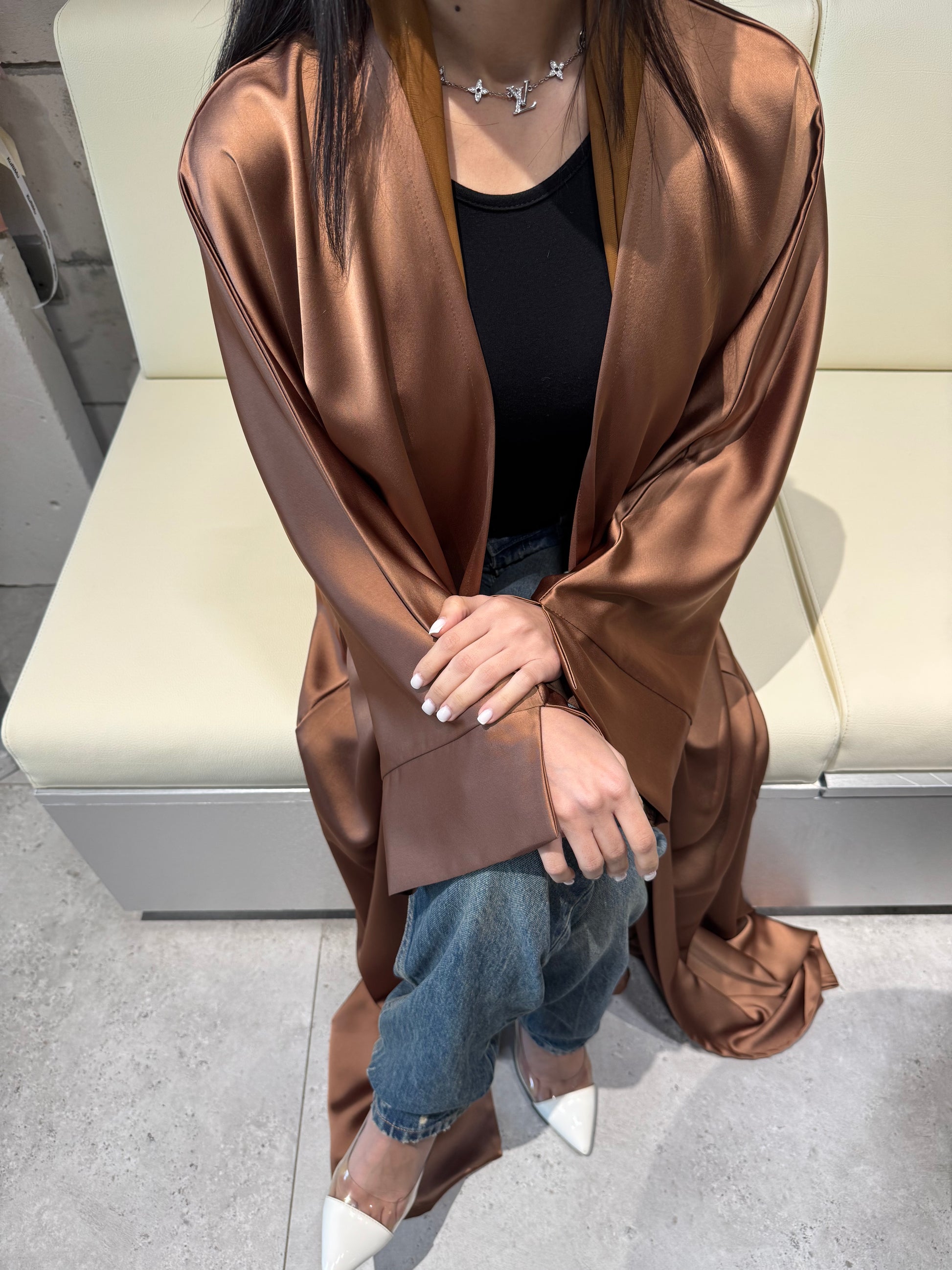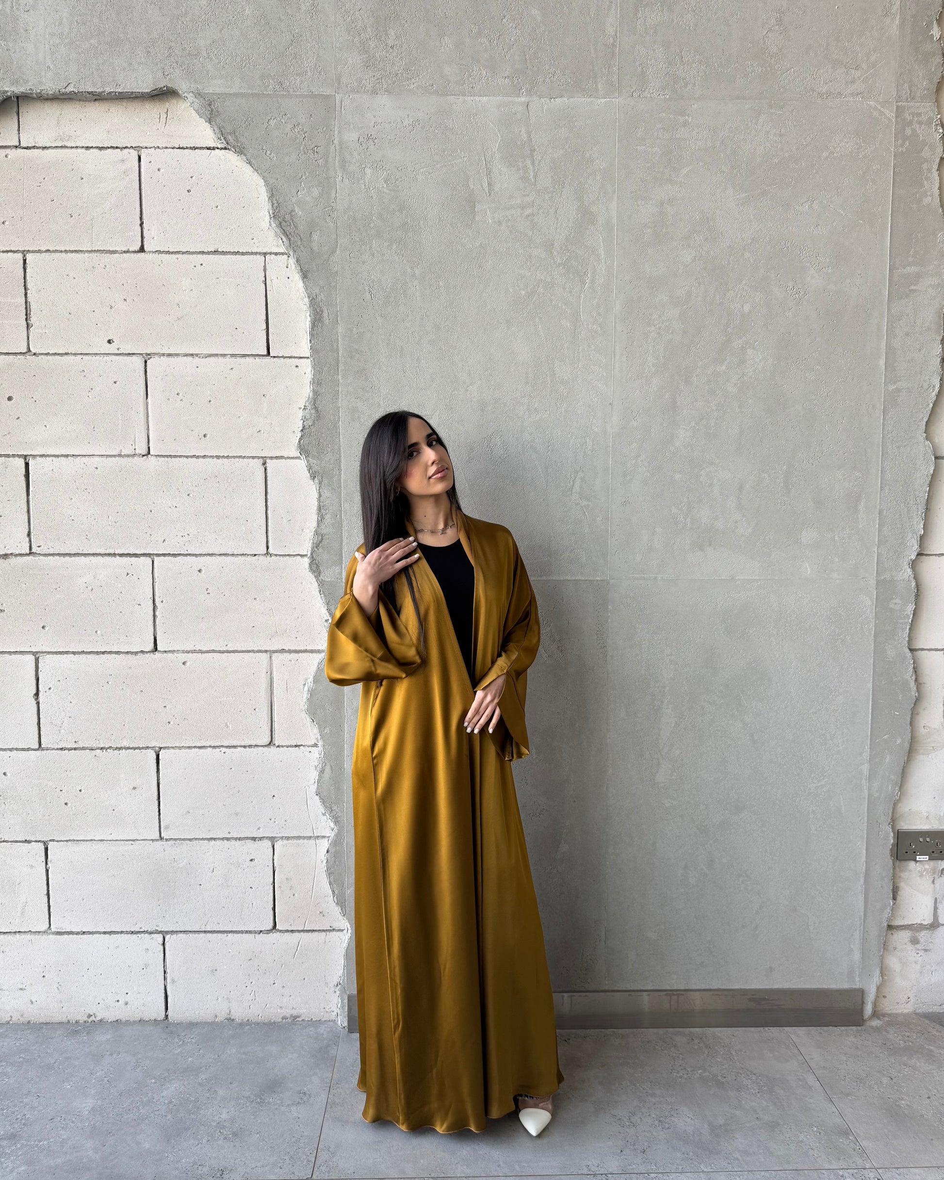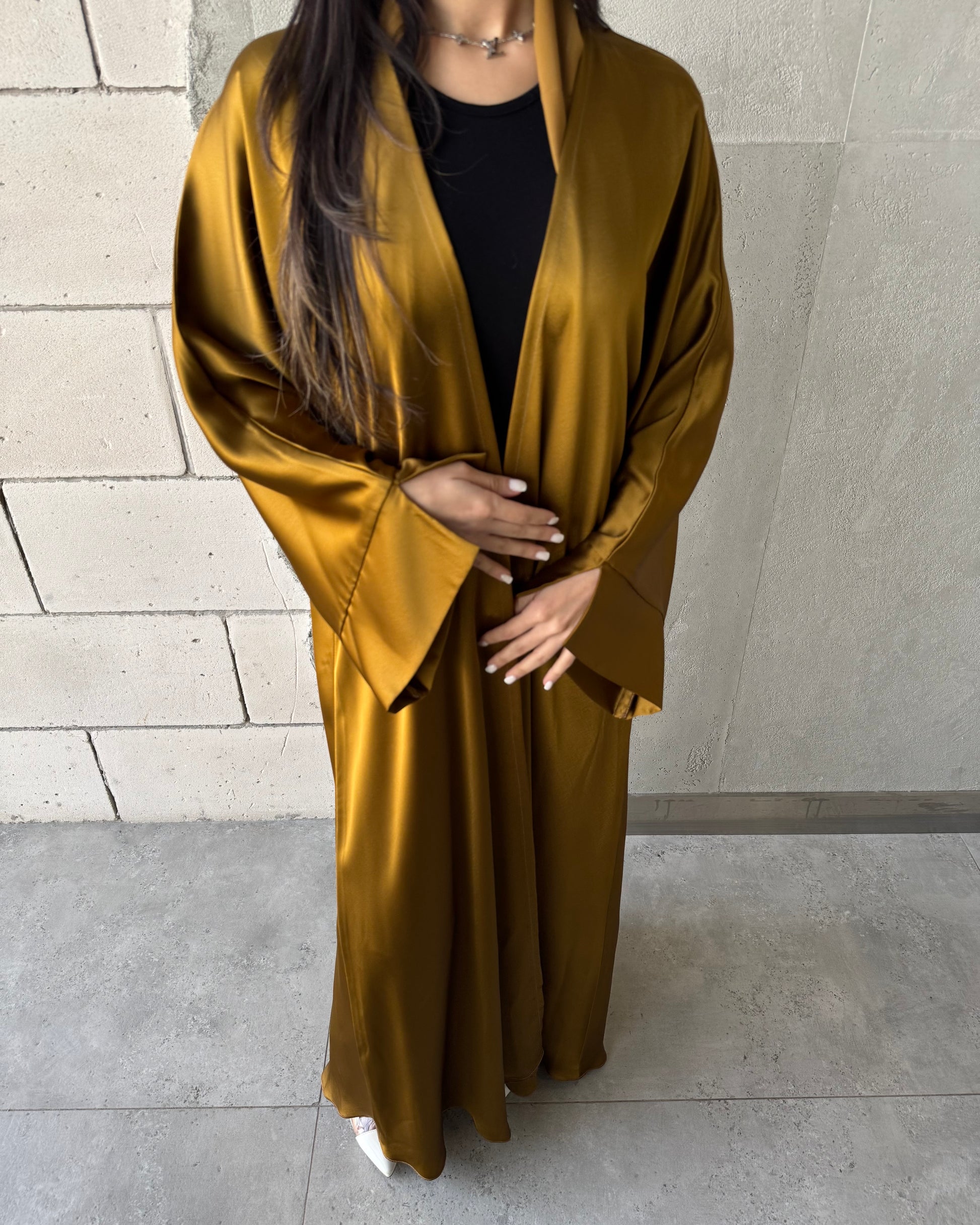 Design: Made from lightweight satin with a soft shine, this abaya is ideal for everyday wear. The fabric has a slightly textured, structured feel rather than a smooth, silky finish.