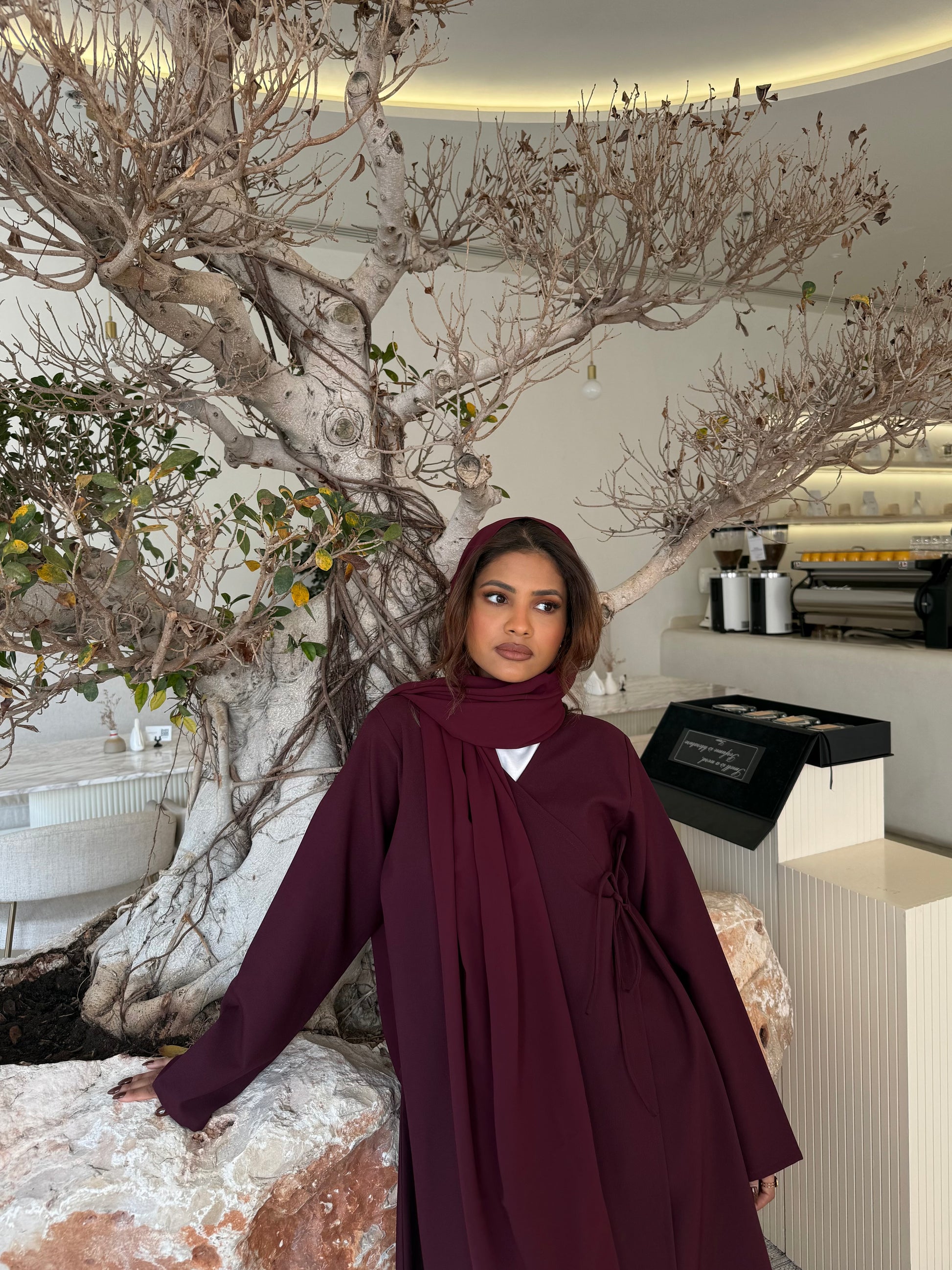 Design: Wrap abaya with a soft front drape and side tie.