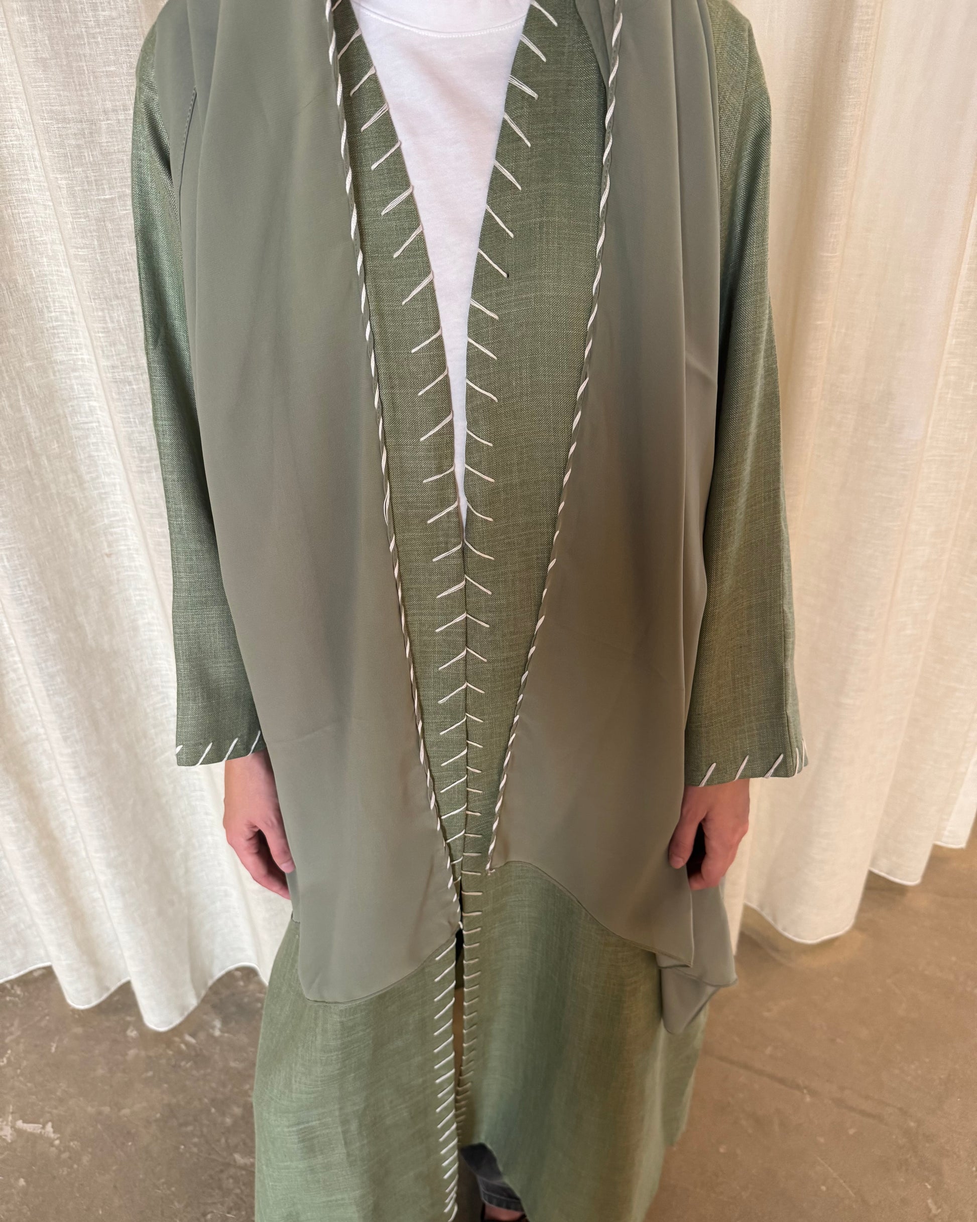 Design: White thread detailing on the front and sleeves of the abaya.
