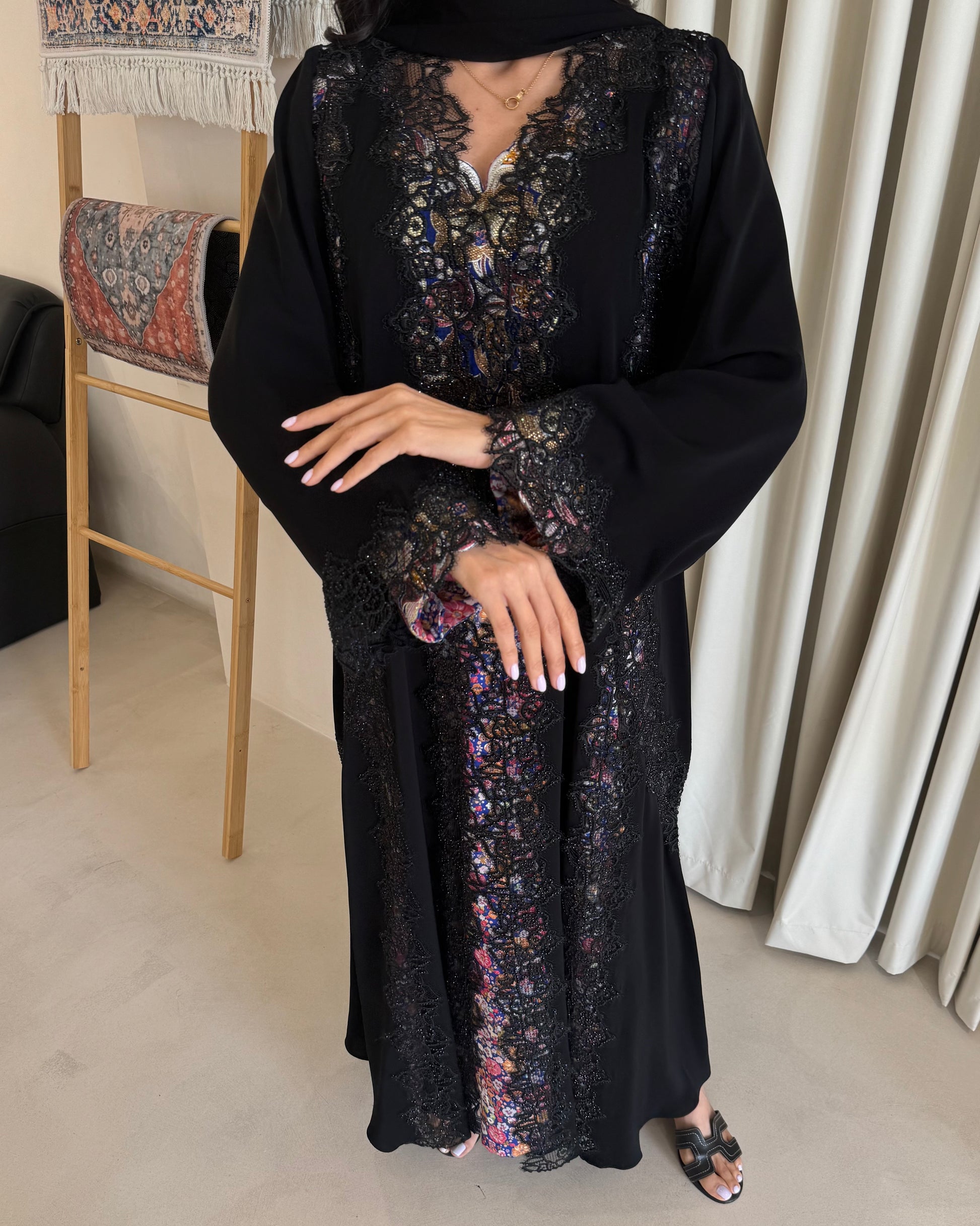 Design: Elegant and timeless, this black abaya features intricate lace detailing along the front panels and beautifully placed lace accents running down the back, creating a striking yet sophisticated finish from every angle.