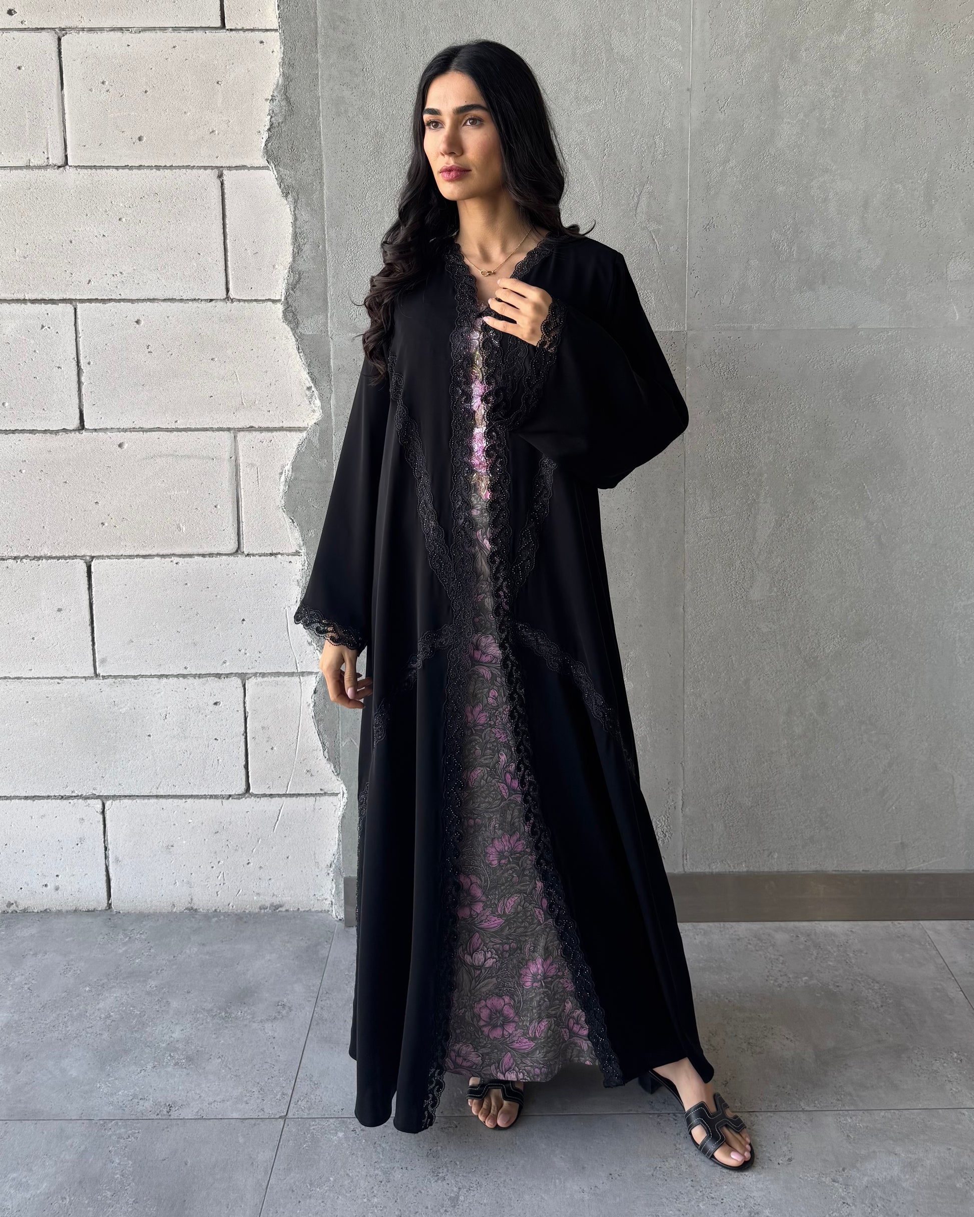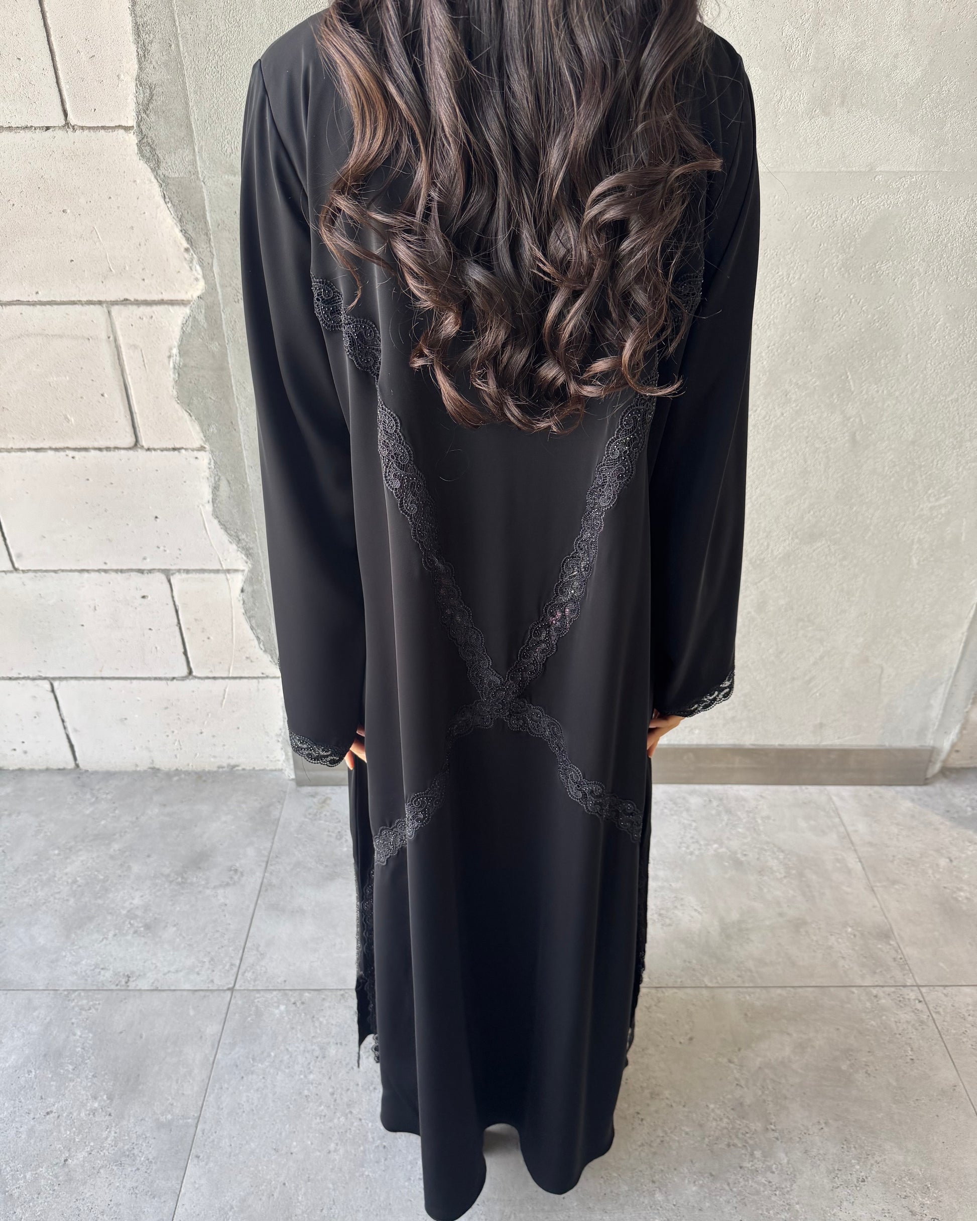 Design: A statement piece black abaya featuring delicate lace and detailed craftsmanship. While it can be worn for daytime outings, this design is best suited for occasion wear and moments that call for something special rather than everyday use.