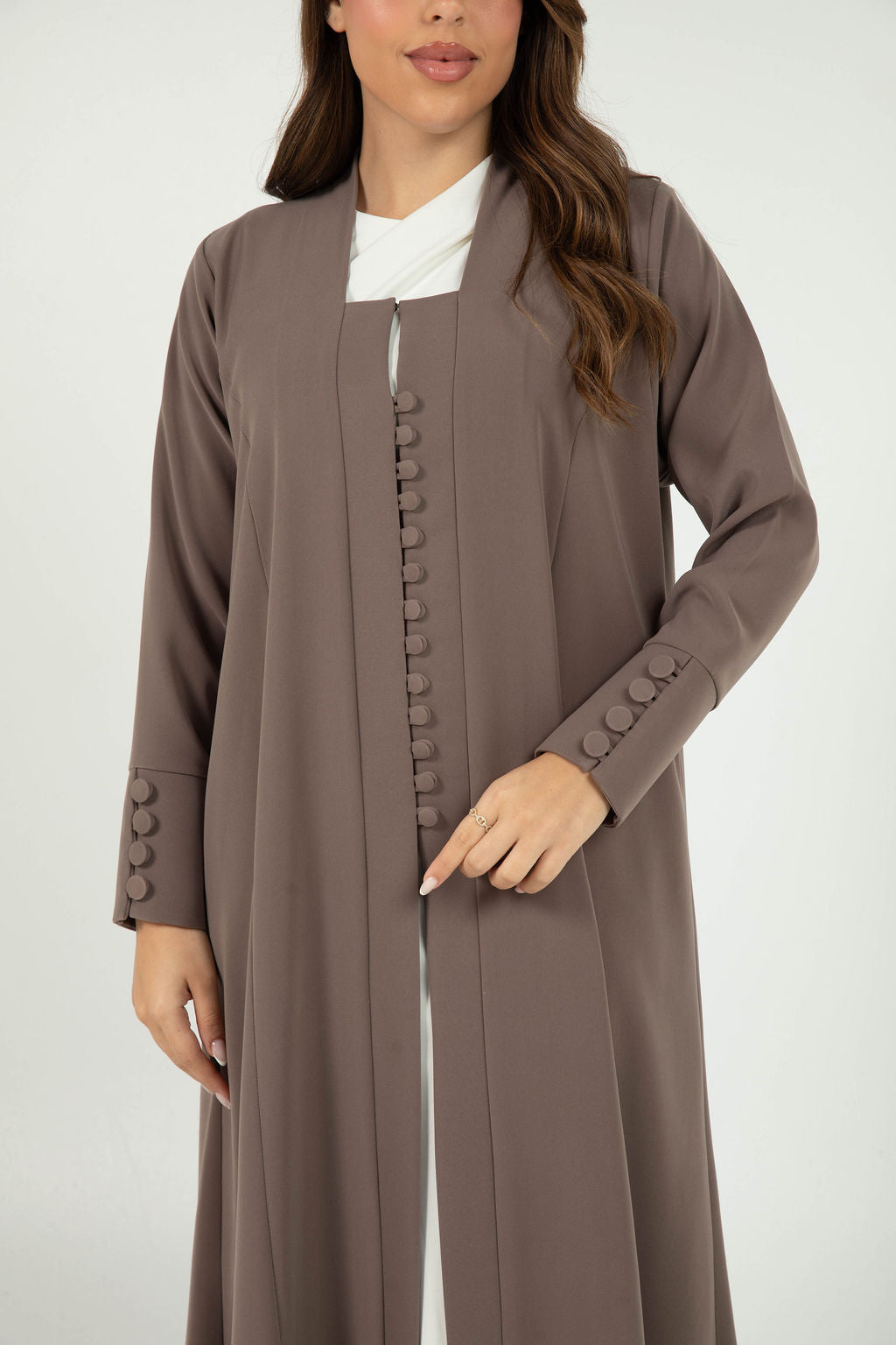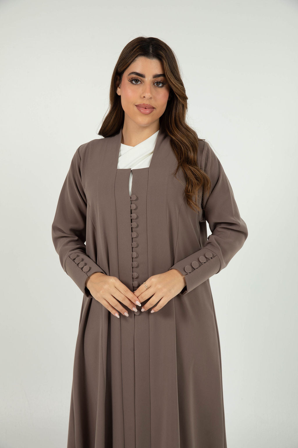 Design: Structured pleats and matching fabric buttons down the front and sleeves.
