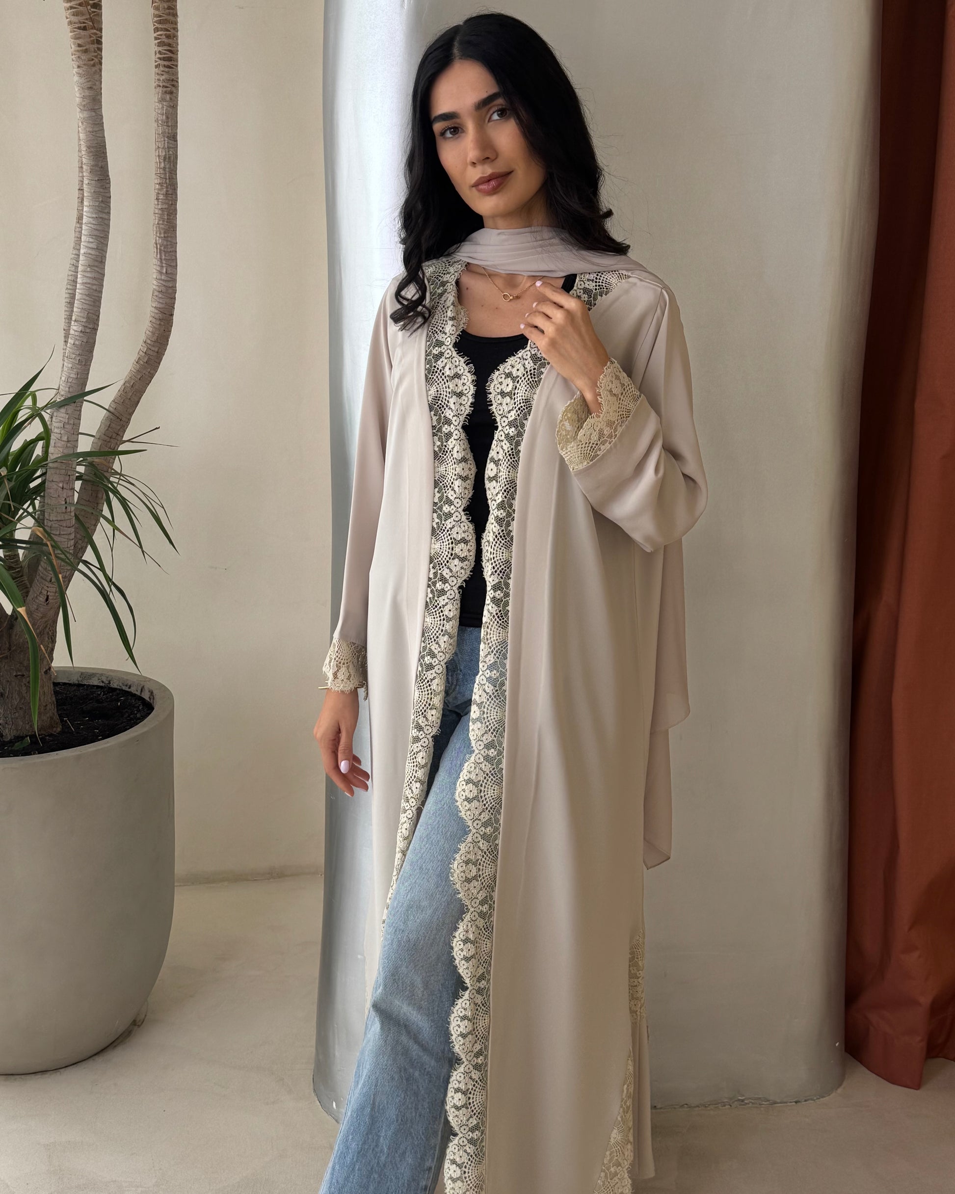 Design: An elegant lace abaya that features lace panels on the front and arms as well as the side of the abaya.