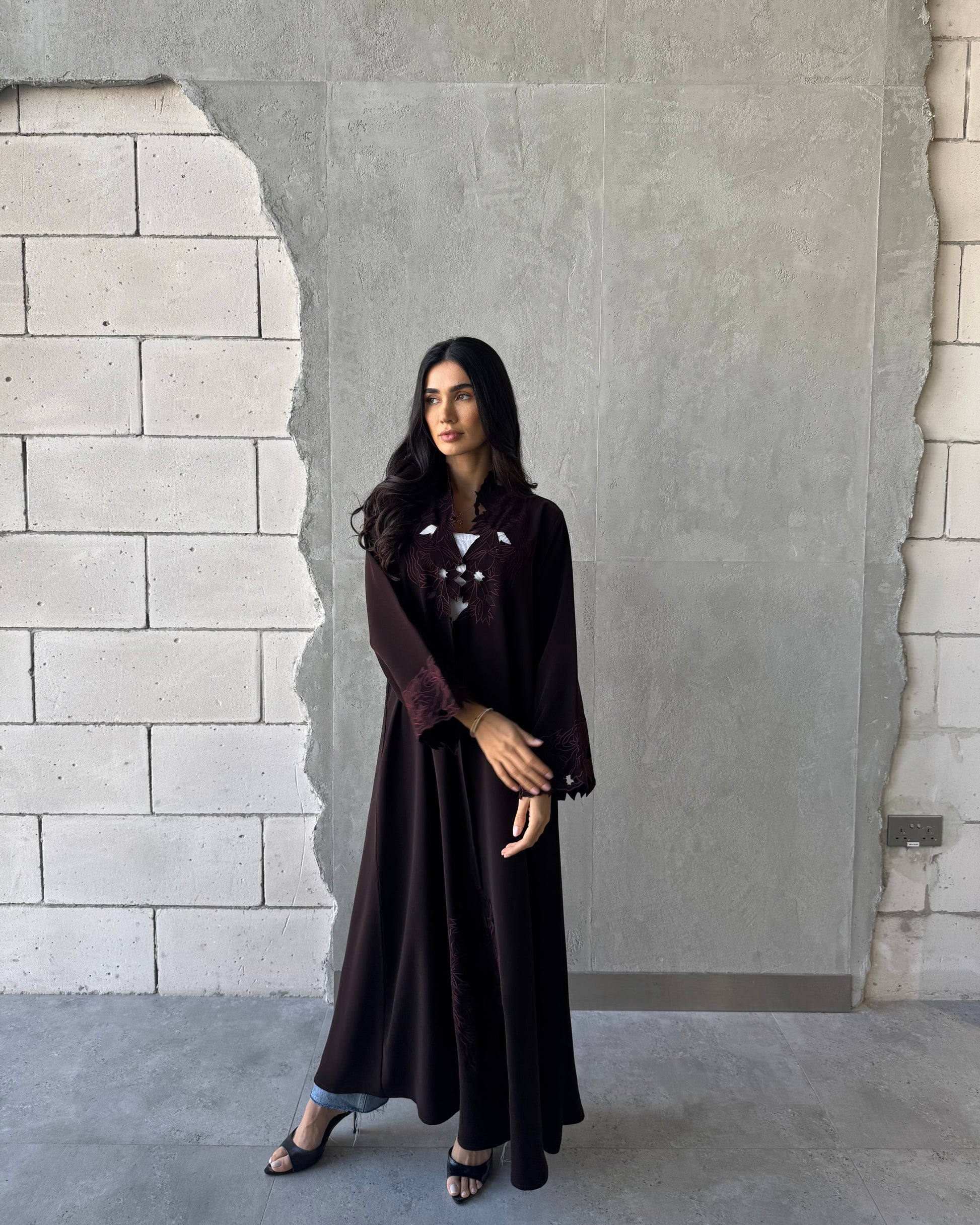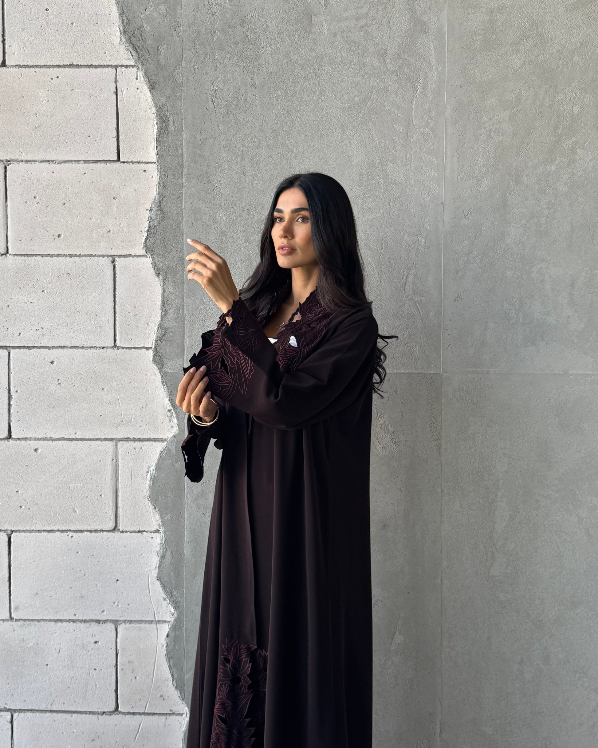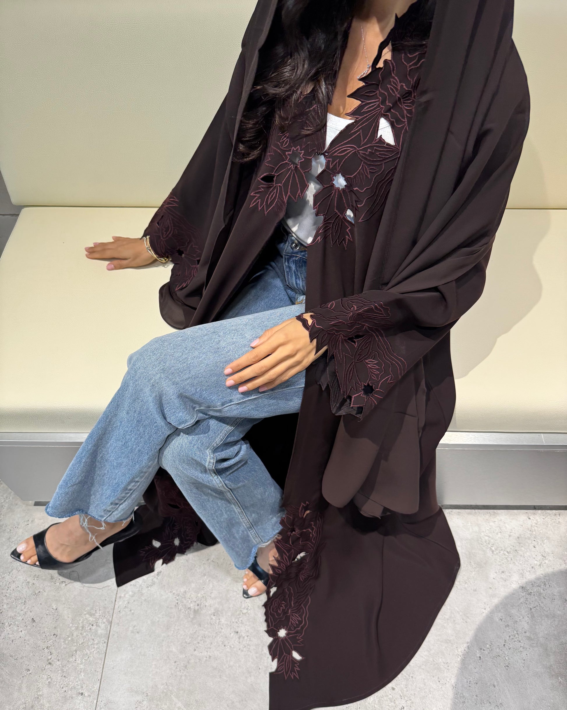 Design: A refined abaya featuring intricate cut-out embroidery along the sleeves and front panels.