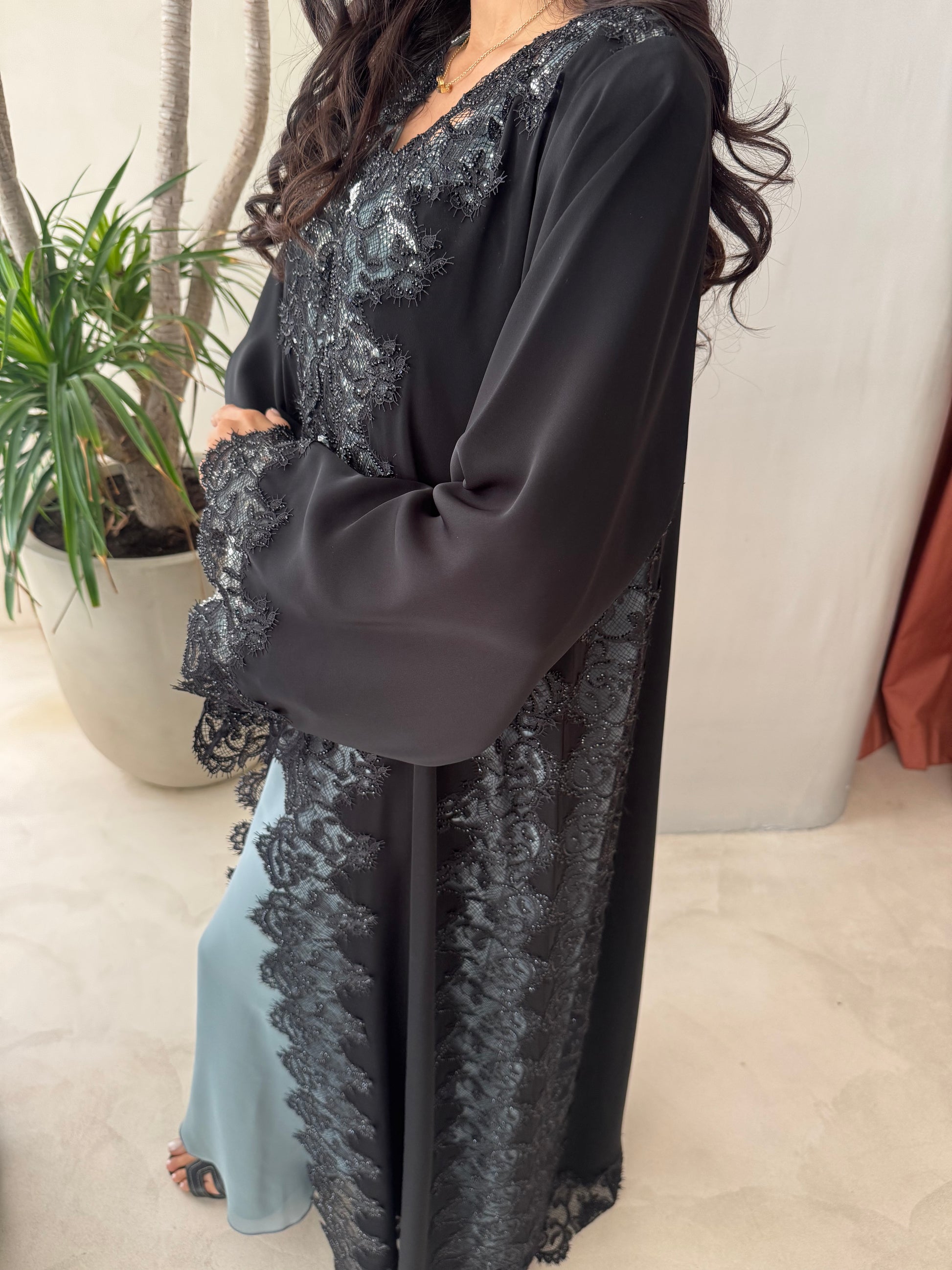 Design: A statement piece black abaya featuring delicate lace and detailed craftsmanship. While it can be worn for daytime outings, this design is best suited for occasion wear and moments that call for something special rather than everyday use.