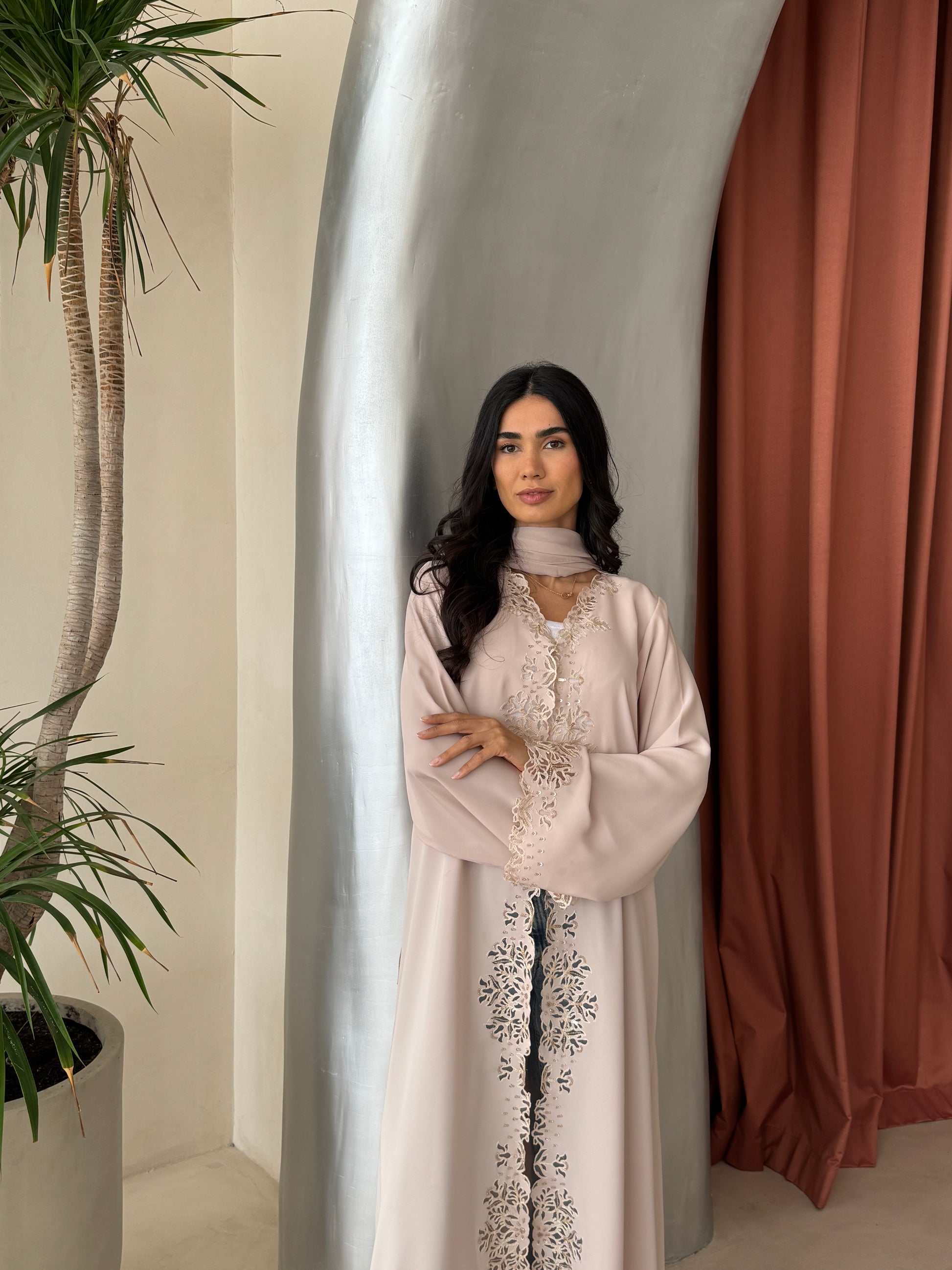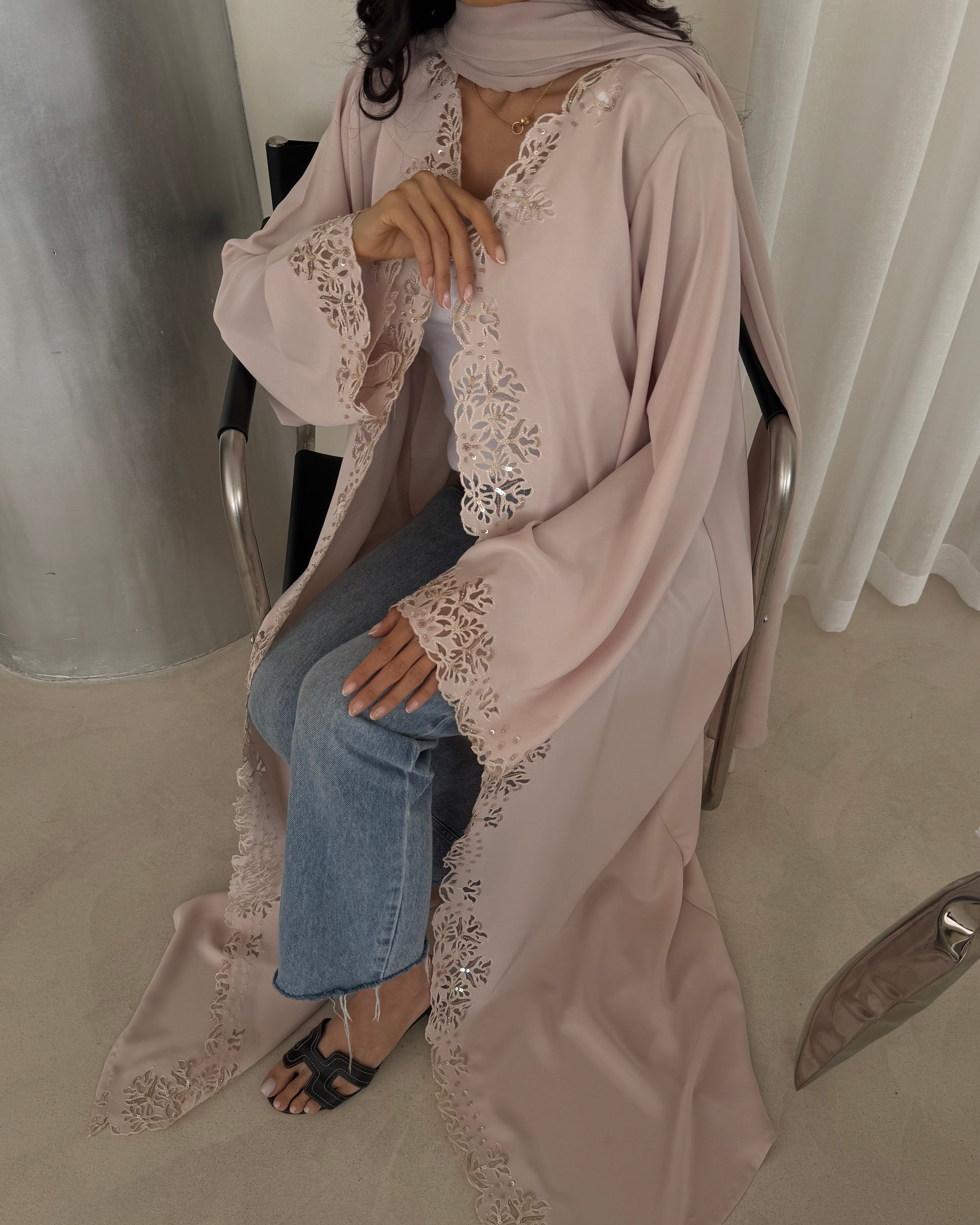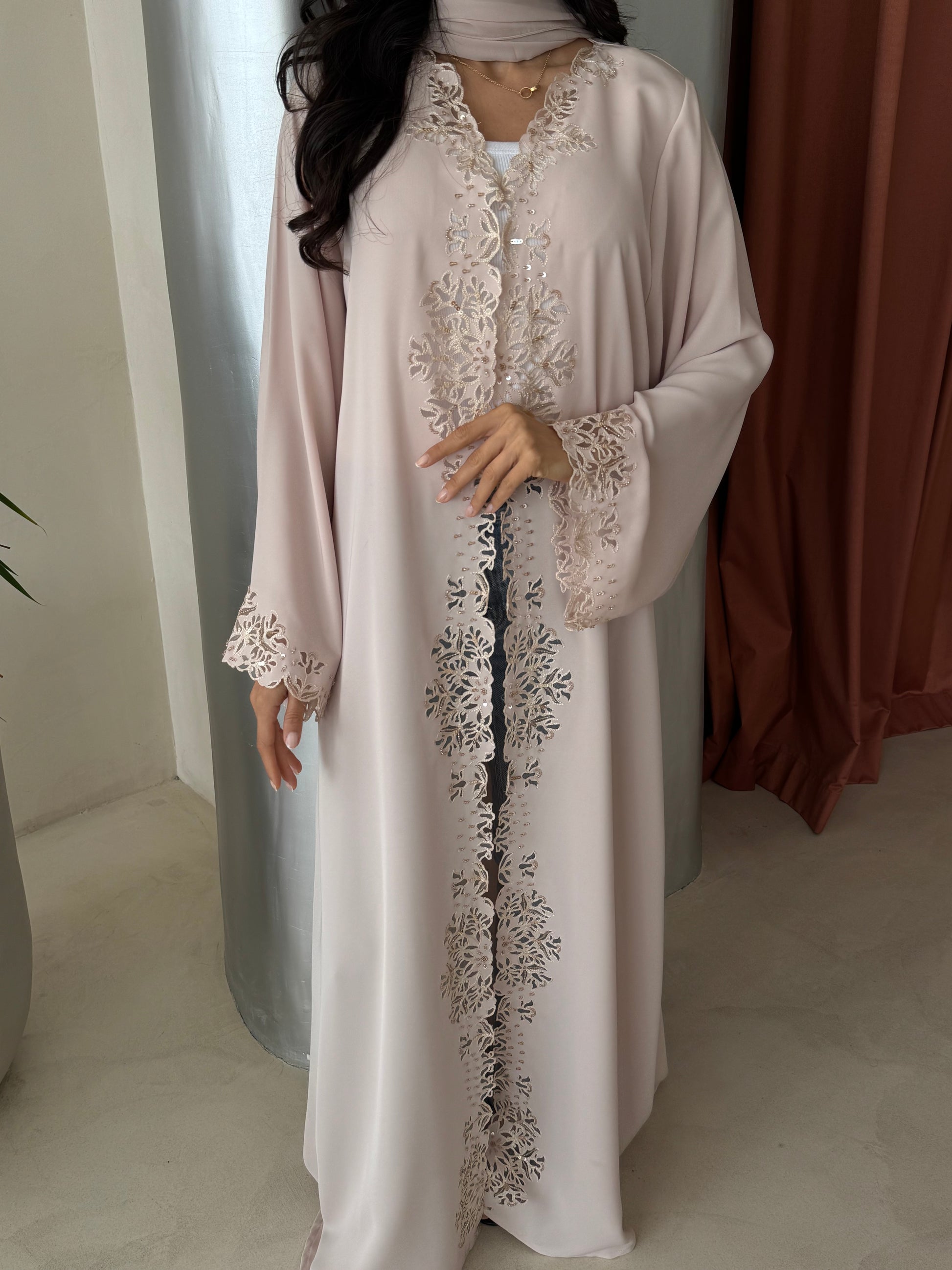 Design: A elegant designed abaya, featuring laser-cut motifs and embellishments along with a distinguished cut that accentuates the front and sleeves.