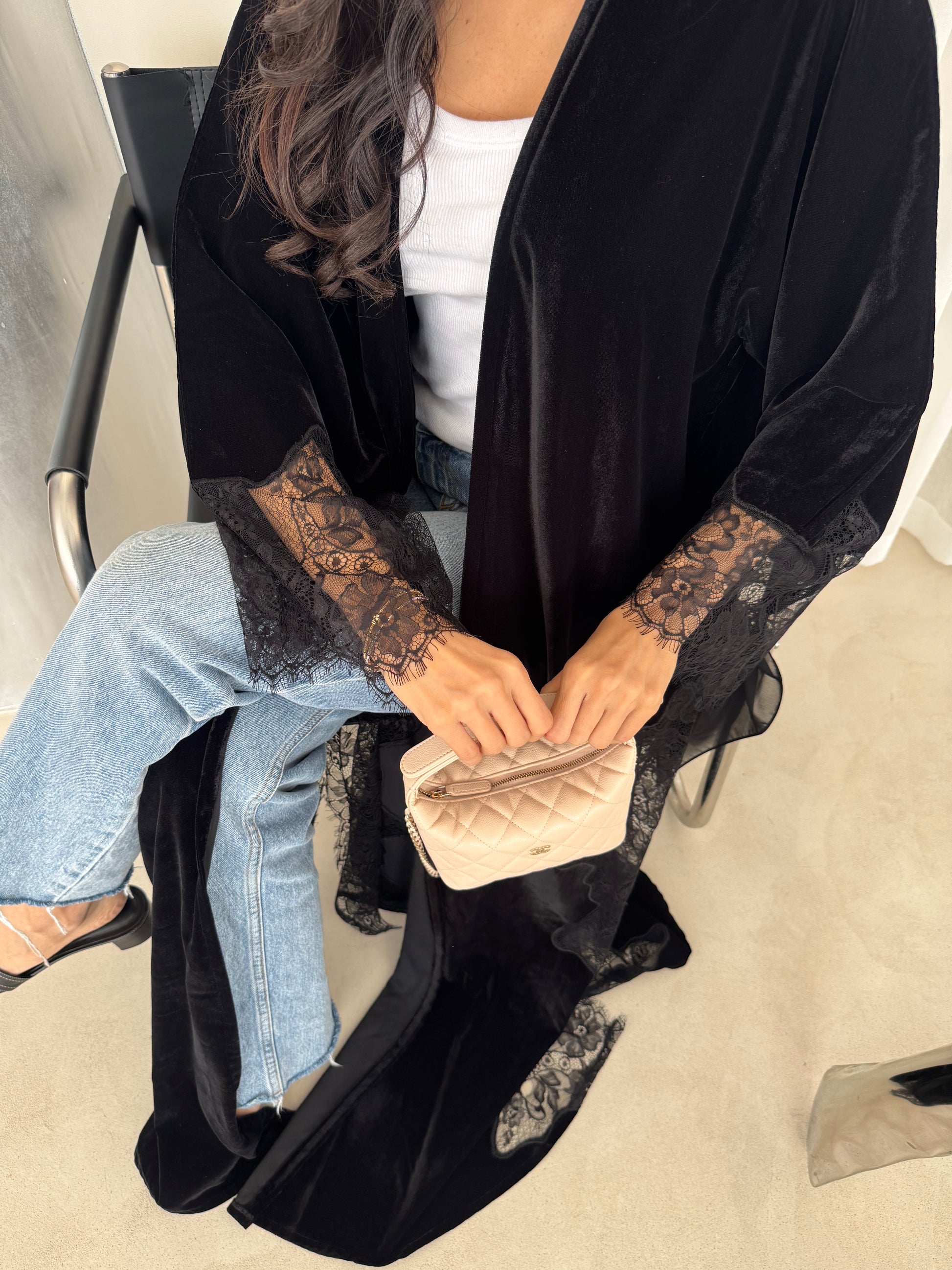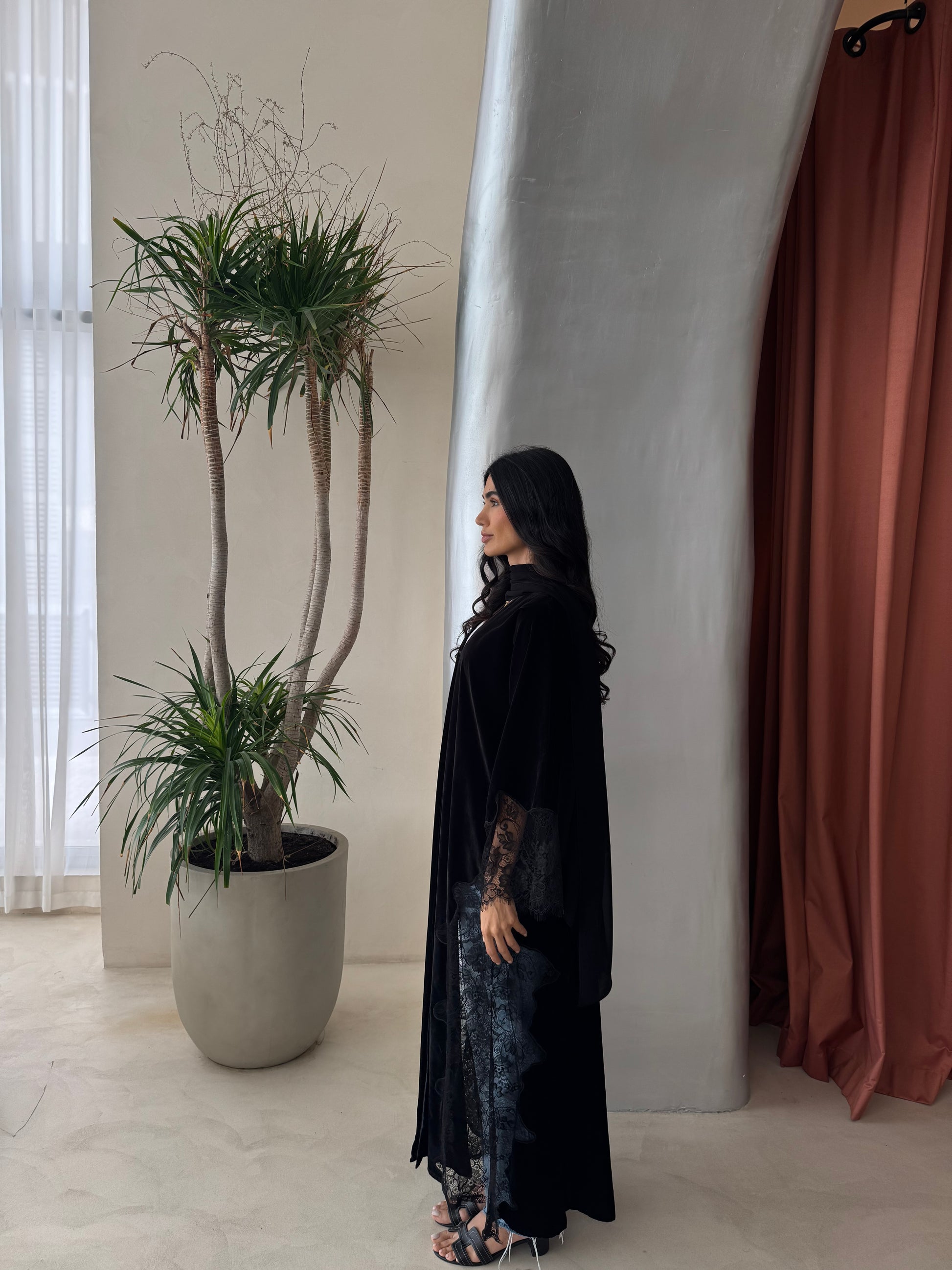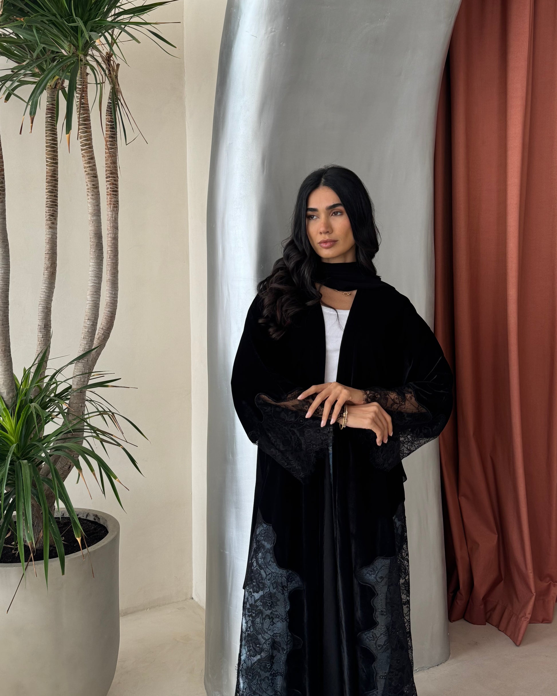 Design: French black lace abaya on the arms and sides of the abaya with a slit for a sophisticated design.